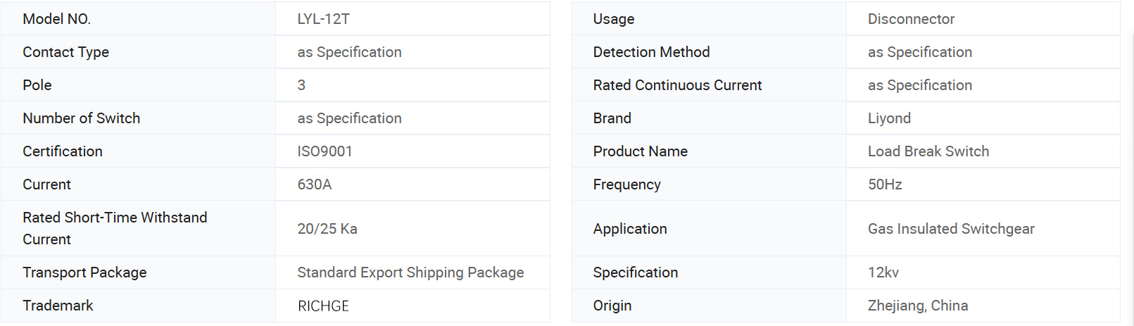 Comhlíonann lasc ualaigh LYL-12T na ceanglais ábhartha de GB3804-2004 "3.6kV ~ 40.5kV Lasc Luchtaigh Ardvoltais AC" agus GB16926-1997 "AC AC Fearas Teaglaim Lasc-F-F-Freis Voltais AC". Príomhchiorcad: 630A-20KA (4S), 25KA (3S); Saol meicniúil: 5000 uair; Ciorcad talún: 20ka (2s); Saol meicniúil: 2000 uair.