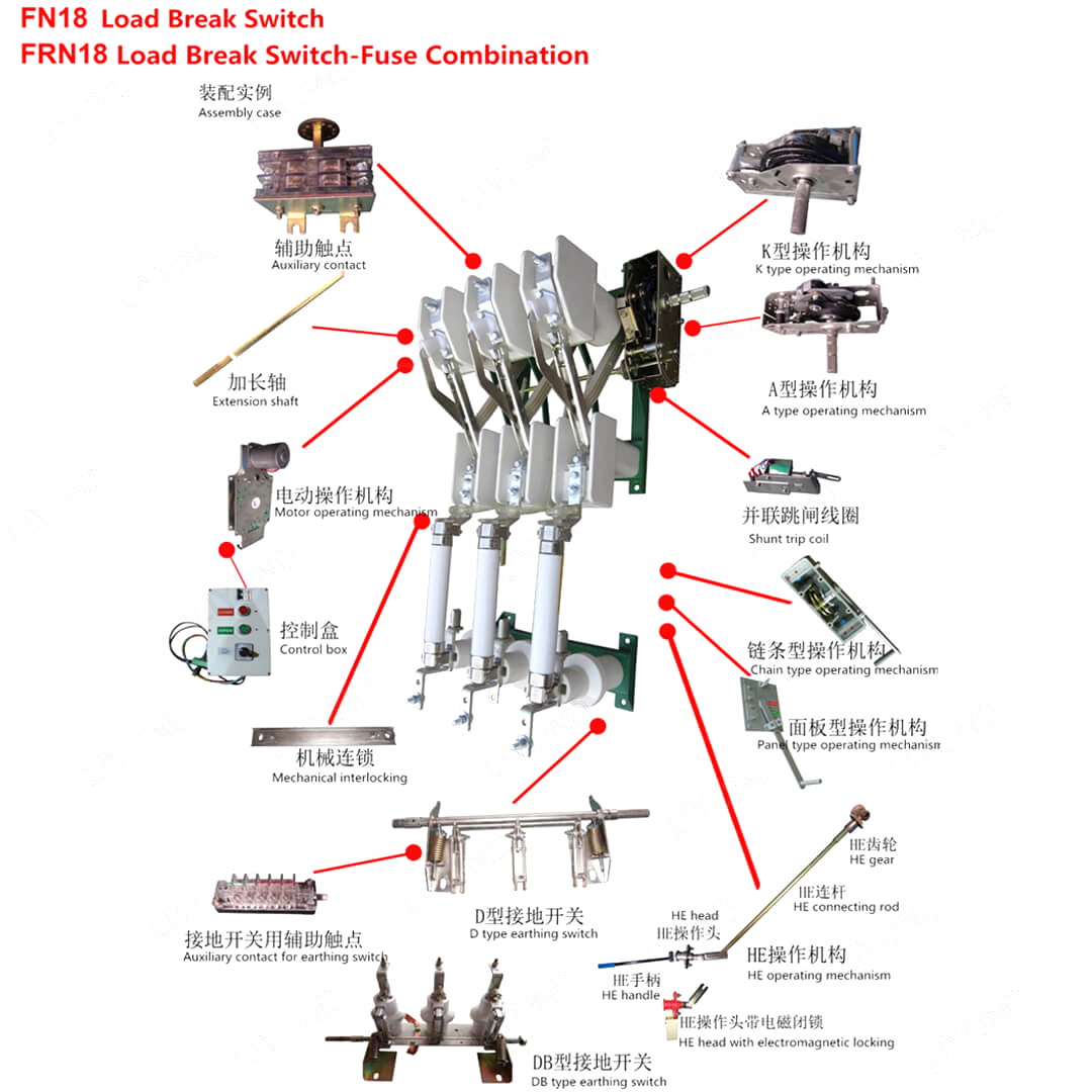 Is cuspóir ginearálta é FN18-D, lasc sosa ualach trí pholl a thairgeann úinéirí agus cóimeálaithe lascthrealamh na buntáistí a bhaineann le teicneolaíocht ard-idirbhriste agus feidhmíocht chruthaithe, iontaofa i ndearadh dlúth. Tá an lasc ar fáil do chóimeálaithe lascthrealamh mar bhloc tógála d'iarratais lascthrealamh atá faoi iamh miotail agus suite i rátálacha ó 12-40.5 kV. Cuimsíonn an lasc caighdeánach FN18 fráma cruach tromshaothair le inslitheoirí seasaimh, córas múchta de chineál uathúil puffer, meicníocht oibriúcháin agus comhpháirteanna reatha, lena n-áirítear idirghabhálaithe de chineál lann le hingíní teilgthe agus cónaisc JAW. I measc na ngabhálais agus na ngnéithe roghnacha tá éagsúlacht de láimhsithe oibriúcháin, oibreoir mótair, lasca cúnta, gléas turais shunt, boinn fuse, tripping meicniúil meicniúil, lasca talún, idirnascadh dorais mheicniúla agus eochair -chomhcheangal.