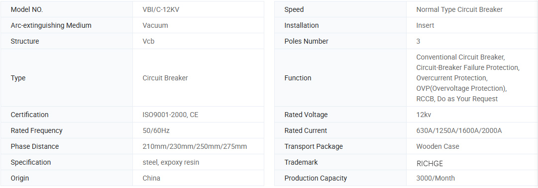 VBI-12 Is cineál trealaimh lasc-voltais faoi dhíon le 50Hz/60Hz trí chéim AC 12kV é an breaker ciorcad voltais mheánmhéide. Comhlíonann an táirge an caighdeán GB1984 & IEC62271-100.